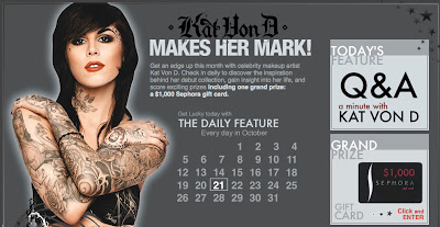 Lucky and Sephora are two go-to places for shopping enthusiasts. Now Lucky and Sephora have come together to sponsor a contest to win a $1,000.00 (one thousand dollars) Sephora gift card: in addition, by visiting Month of Beauty with Kat von D everyday, you can enter giveaways or get makeup tips from tattoo artist Kat von D.