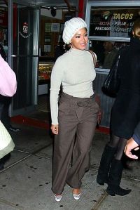 Here’s a photo of Beyonce as we often don’t see her, with little makeup and casually dressed in a knit cap, oversized hoops, a turtleneck, and high-waisted, wide-legged tie-fronts pants.