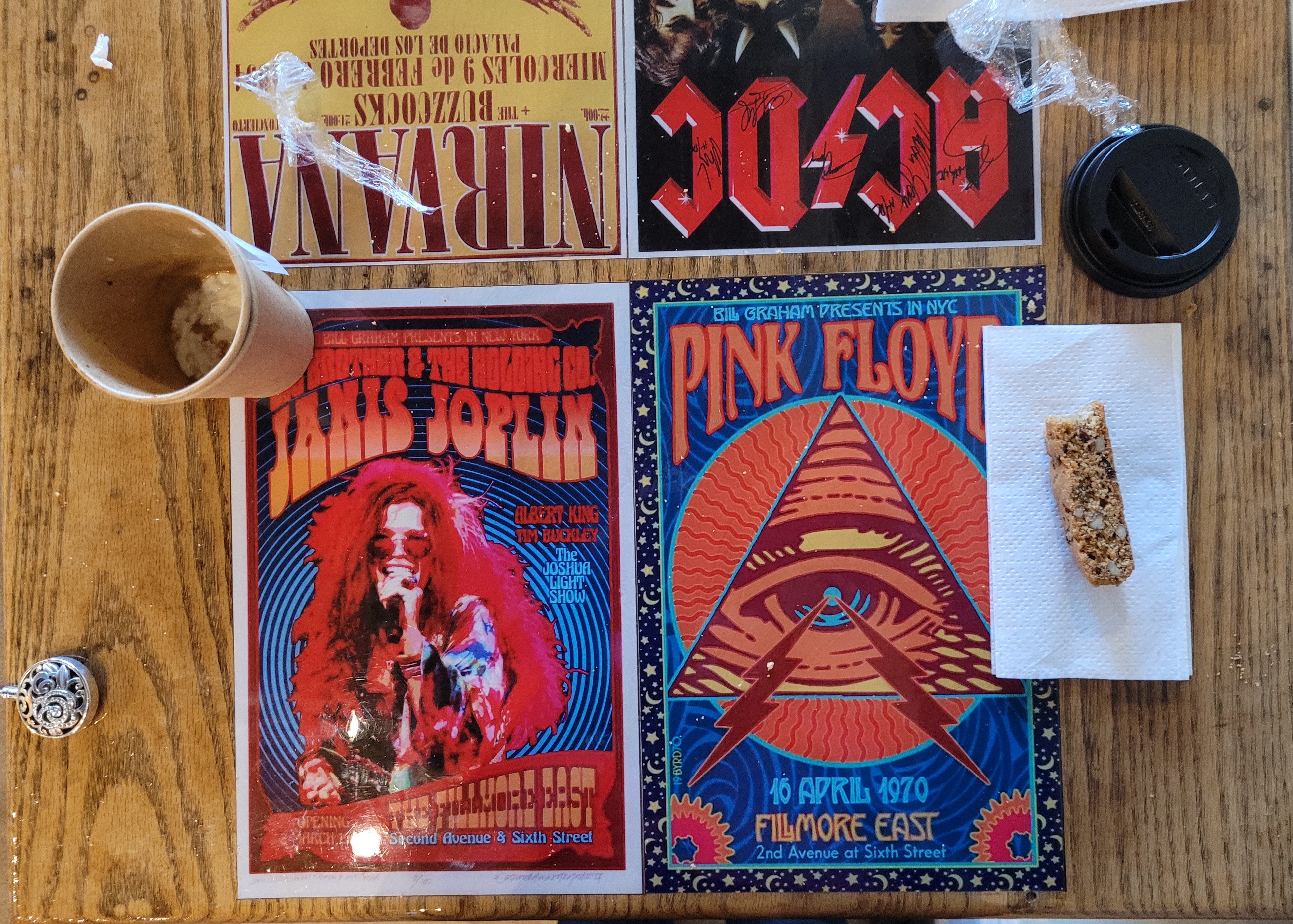 If you follow my blog (ha-ha), you’ll know that I have a laser focus on the late Syd Barrett, formerly of Pink Floyd. When I sat down to enjoy my espresso con panna and biscotti at Caffe Amouri, I found this poster for a Pink Floyd concert at Fillmore East, post-Syd but pre-Dark Side of the Moon. What a coincidence.