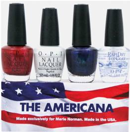 Merle Norman likes to trumpet its “Made in the USA” credentials. OPI created its Americana nail set to celebrate Merle Norman’s heritage. It features red, white and blue mini OPI Nail Lacquers. The Americana nail set features: